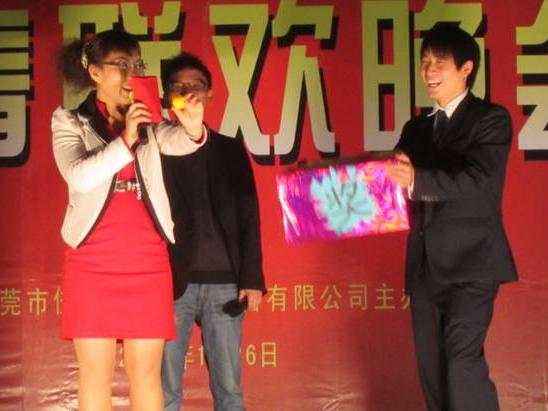 晚會(huì)怎么能少了小品呢?這次的小品《劉三姐招親》是由我們公司銷售部廖小姐策劃的。一名實(shí)為男性的所謂的三姐嚇倒了全場(chǎng)。