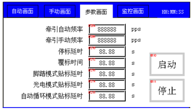 “停標(biāo)延時”,設(shè)定從測標(biāo)傳感器檢測出標(biāo)完成一張后,延時停止出標(biāo)的時間,任何模式有效,(0.0≤設(shè)置值≤32.767單位:秒);