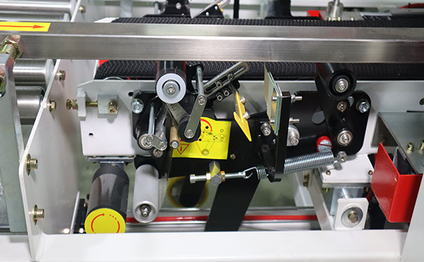 其次,封箱機的機械調整部件也會影響膠帶的走向。封箱機的壓帶裝置和切刀位置如果調整不當,可能會導致膠帶在封箱過程中偏離預定軌道。檢查壓帶裝置是否牢固,切刀位置是否準確,以及機械部件是否有松動或損壞,這些都可以有效避免膠帶跑偏的問題。